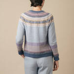 Rund um den Hals strahlt das ikonische Alpine-Fair-Isle-Muster wie ein farbenreicher Kranz. Zarte Lila-, Blau- und Naturtöne tanzen harmonisch zusammen und verleihen der Strickjacke eine künstlerische Ausstrahlung. Der untere Rand und die Ärmelbündchen wiederholen dieses raffinierte Spiel, wodurch das Ganze wunderschön im Gleichgewicht bleibt.