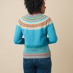 Rund um den Hals bildet das ikonische Alpine-Fair-Isle-Muster einen farbenreichen Bogen aus Rot, Gelb, Rosa und frischen Grüntönen. Der Kontrast zum klaren Aqua erzeugt eine spielerische Spannung, während die subtile Wiederholung an Bündchen und Saum für eine harmonische Komposition sorgt.