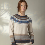 Das Alpine Fair-Isle-Muster rund um den Hals entfaltet sich wie eine feine Horizontlinie. Die sorgfältig aufgebauten Farbschichten verleihen Rhythmus und Bewegung, ohne den ruhigen Charakter zu verlieren. In Bund und Manschetten kehren die Töne zurück und verankern das Design visuell.