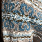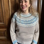 Diese Leichtigkeit spiegelt sich in der Farbgestaltung dieser Ausführung wider. Die sanfte sandfarbene Basis erinnert an Küstenlinien und Dünen, während die klaren Aqua- und Hellblautöne im Fairisle-Schulterbereich auf schäumende Wellen, klares Wasser und offenen Himmel verweisen. Das Zusammenspiel dieser frischen Farben verleiht dem Pullover eine lebendige und zugleich ausgewogene Ausstrahlung.