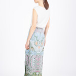 Der stylische IVKO Rock mit Ornamentmuster vereint Farbe, Bewegung und raffinierte Eleganz in einem auffälligen Design. Die sanften Blautöne mit grünen und rosa Akzenten bilden ein reiches, fast keramisches Muster, das an klassische Ornamentkunst und mediterrane Fliesenmotive erinnert.