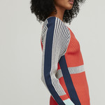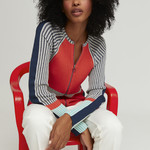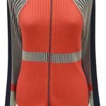A sexy Aldo Martins jacket in orange-red, blue and grey. The jacket closes with a zipper. The Aldo Martins jacket is made of 33% bamboo and 20% cotton.