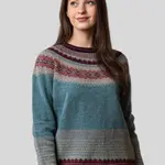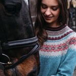 The special Eribé Alpine Sweater Oldrose invites you into a quiet rose garden at dawn, where petals float softly across a still pond. The teal-blue colour of the sweater reflects the water of the pond, while gentle rose hues create a romantic, dream-like atmosphere.