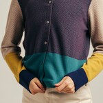 Across the muir, deep greens, purple shades and warm earthy tones subtly shift with the light and the seasons. That natural layering is reflected in this cardigan. The interplay of rich purple, clear ochre and teal tones creates a balanced composition with character.