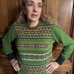 That rugged purity and deep connection to nature are reflected in this sweater. The deep green echoes grass clinging to steep slopes, while accents of mustard yellow, brown and soft blue tones recall sea, rock and the shifting light above the ocean. The Fair Isle pattern creates a lively rhythm, as if wind and waves were captured in wool.