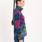 A radiant KOOI cardigan made of 80% lambswool and 20% polyamide. With zip, pockets and high collar. The vivid mix of fuchsia, blue and yellow creates a warm, energetic work of art.