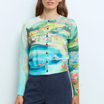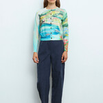Cardigan Aldo Martins pittoresque avec paysage illustratif en couleurs fraîches. Le devant, le dos et les manches présentent chacun un motif différent. Confectionné en 80% coton et 20% soie. Il existe aussi un pull avec le même motif.