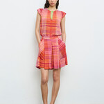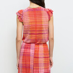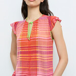 Les manches courtes avec une finition légèrement ondulée apportent une touche ludique et féminine. La coupe droite assure une silhouette décontractée et moderne.