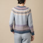 Autour du cou, le motif iconique Alpine Fair Isle brille comme une couronne colorée. De douces nuances de lilas, de bleu et de tons naturels dansent harmonieusement ensemble et donnent au cardigan une allure artistique. Le bord inférieur et les poignets répètent ce jeu raffiné, de sorte que l’ensemble reste magnifiquement équilibré.