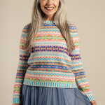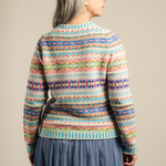 Le expressif Eribé Kinross Sweater Mural, en 100% laine d’agneau extra-fine, associe des tons d’orangé-rouge, de rose, de vert et de bleu dans un motif Fairisle évoquant des fresques murales colorées.