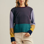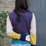 Sur la muir, les verts profonds, les nuances violettes et les tons chauds et terreux se succèdent subtilement selon la lumière et les saisons. Cette stratification naturelle se retrouve dans ce pull. L’association d’un violet riche, d’un ocre lumineux et de tons vert-bleu crée une composition équilibrée et pleine de caractère.