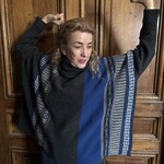 Cette énergie se reflète dans le design. Le jeu entre l’anthracite profond, le bleu roi et les motifs finement tissés crée des lignes verticales qui suggèrent le mouvement. Le large col drapé enveloppe le cou comme un nuage protecteur, tandis que la silhouette ample apporte une allure fluide, presque aérienne.
