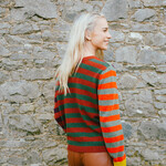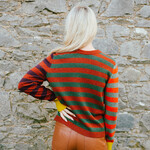 Le polyvalent Eribé Stobo Stripe Sweater Harissa en 100% laine d’agneau est réversible et associe rouge profond, vert olive et orange chaud, inspirés de la sauce harissa.