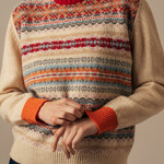 Confectionné en 100% laine Shetland douce et embelli de détails Fair Isle et d’un jeu de colour blocking moderne, ce pull incarne chaleur, authenticité et raffinement. Sa palette de rouge, beige, bleu et orange évoque les bateaux de pêche dans le port, les vagues écumantes et la lueur flamboyante d’un coucher de soleil sur la côte ouest.
