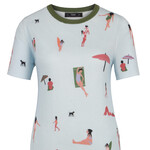 Le shirt joyeux IVKO avec illustrations de plage évoque l’atmosphère légère d’une journée ensoleillée au bord de la mer. Sur le fond bleu clair apparaissent de petites illustrations de personnes profitant du soleil, du sable et de la mer : allongées sur une serviette, marchant le long de l’eau ou se reposant sous un parasol.
