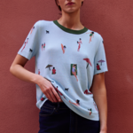 Les figures ludiques sont associées à des détails tels que des planches de surf, des parasols et de petites silhouettes de chiens. Ensemble, ils créent un motif vivant qui donne au shirt une allure légère et pleine d’humour.