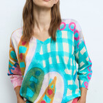 Deze opvallende Aldo Martins trui trekt direct de aandacht door het speelse, bijna schilderachtige dessin in frisse en harmonieuze kleuren. De vloeiende vormen en zachte kleurovergangen geven het ontwerp een artistiek en eigentijds karakter.