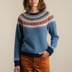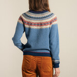 Rond de hals ontvouwt het Alpine Fair Isle-patroon zich in lagen van rood, crème, zand en diep marineblauw. Het contrast tussen het frisse blauw en de warme accenten geeft het ontwerp levendigheid zonder druk te worden. Het dessin keert subtiel terug in de manchetten en zorgt voor een harmonieus geheel.