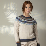De krachtige Eribé Alpine Short Sweater Taurus combineert warme natuurtinten met diepblauwe accenten in het iconische Fair Isle-patroon. Gemaakt van 100% merinowol. Compact, comfortabel en karaktervol.