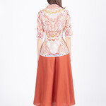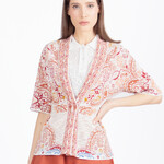 Het verfijnde IVKO vest met ornamentpatroon combineert een rijk jacquarddessin met een vrouwelijke, getailleerde pasvorm. De crèmebeige basis wordt doorbroken door sierlijke patronen in terracotta, oranje en framboos, waardoor een levendig en harmonieus geheel ontstaat dat doet denken aan klassieke ornamentmotieven.