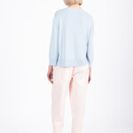 Het dromerige IVKO vest met geborduurde bloemen laat zien hoe subtiele details een kledingstuk een heel eigen sfeer kunnen geven. Op de tedere blauwe basis verschijnen fijne borduursels van bloemen en takjes in frisse tinten lila, roze, groen en oranje. De borduursels lijken bijna losjes over de stof te zijn gestrooid, waardoor het vest een lichte en speelse uitstraling krijgt.