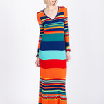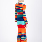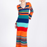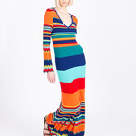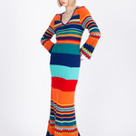 Deze spannende IVKO jurk trekt direct de aandacht met haar levendige streepdessin in krachtige, contrasterende kleuren. Het speelse patroon en de rijke kleurcombinaties geven de jurk een uitgesproken en modieuze uitstraling.