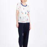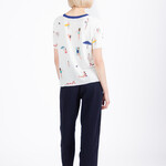 De verschillende miniatuurscènes geven het shirt een speelse en bijna verhalende uitstraling. Elke illustratie lijkt een klein moment van vakantie vast te leggen, waardoor het patroon een ontspannen en zomers karakter krijgt.