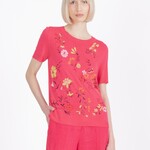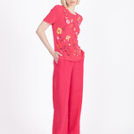 Het poëtische IVKO shirt met geborduurde bloemen straalt een lichte, bijna dromerige elegantie uit. Op de heldere roze basis ontvouwt zich een speels veld van geborduurde bloemen in frisse tinten geel, roze, zwart en oranje. De fijne takjes en bloemblaadjes lijken als kleine penseelstreken over de stof te zijn geplaatst.