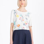 Het poëtische IVKO shirt met geborduurde bloemen straalt een lichte, bijna dromerige elegantie uit. Op de zachte witte basis ontvouwt zich een speels veld van geborduurde bloemen in frisse tinten geel, turquoise, rood en oranje. De fijne takjes en bloemblaadjes lijken als kleine penseelstreken over de stof te zijn geplaatst.