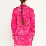 De sierlijke kraag vloeit over in een verfijnd patroon dat ook aan de onderkant van het vest terugkomt, waardoor een harmonieuze en evenwichtige uitstraling ontstaat. De levendige roze- en roodtinten, gecombineerd met het rijke jacquardmotief, geven dit vest een expressieve, vrouwelijke energie.