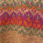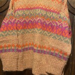 Het kleurenspel van oranje, fuchsia en zachte groentinten vormt een opvallend, warm patroon dat zowel speels als modern oogt. De rijke, pluizige structuur van de alpacawol voelt zacht, licht en heerlijk behaaglijk aan op de huid.