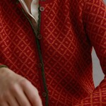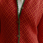 Het regelmatige patroon vormt een rustig raster dat mooi contrasteert met de levendige kleur. De contrasterende bies langs hals, sluiting en boord brengt scherpte in het ontwerp en benadrukt de contouren van het vest. De knopen vormen een natuurlijk verlengstuk van het dessin en zorgen voor samenhang in het geheel.